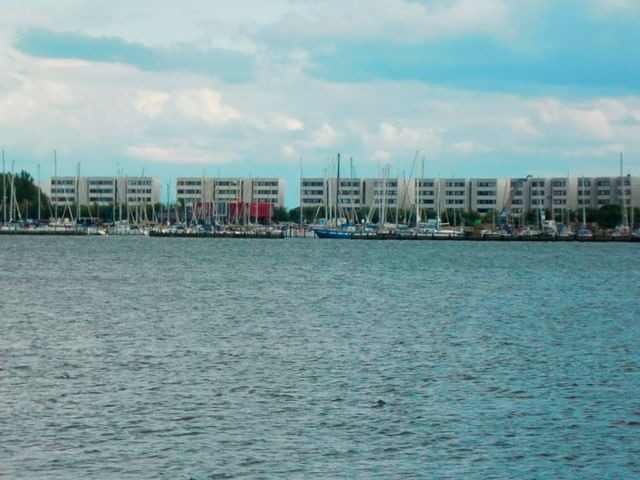 Blick auf Yachthafen und Binnensee, 1 Minute vom Strand entfernt.